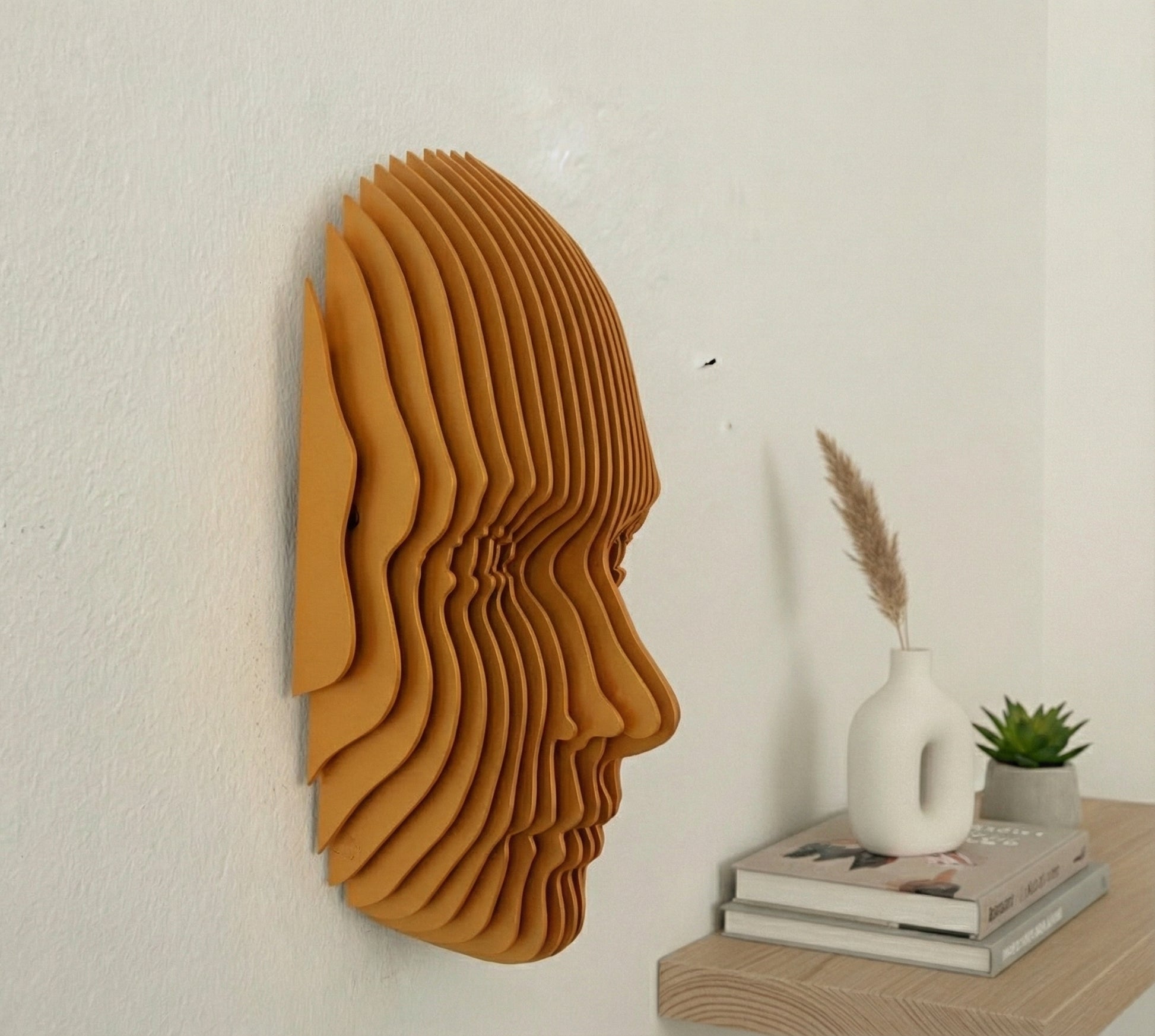 Parametrik Ahşap Yüz Duvar Dekoru – 3D Katmanlı Geometrik | Modern El Yapımı Duvar Sanatı