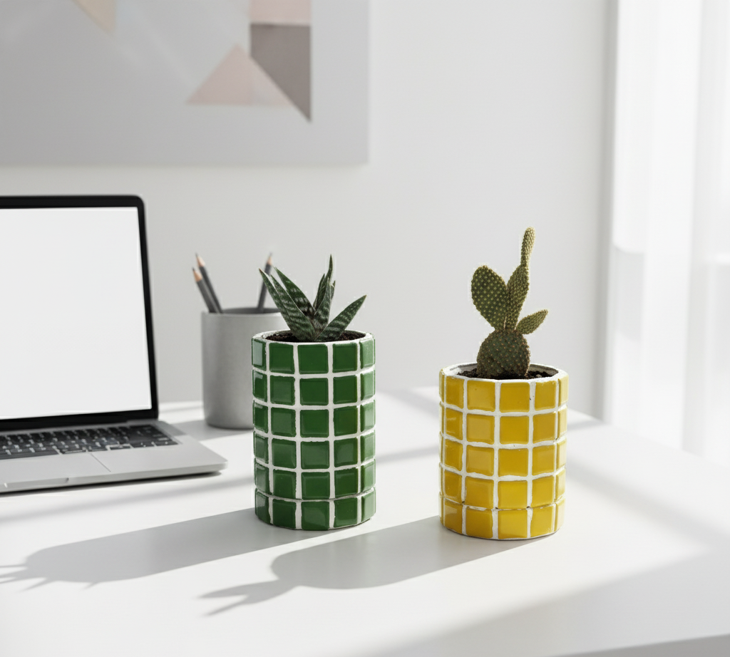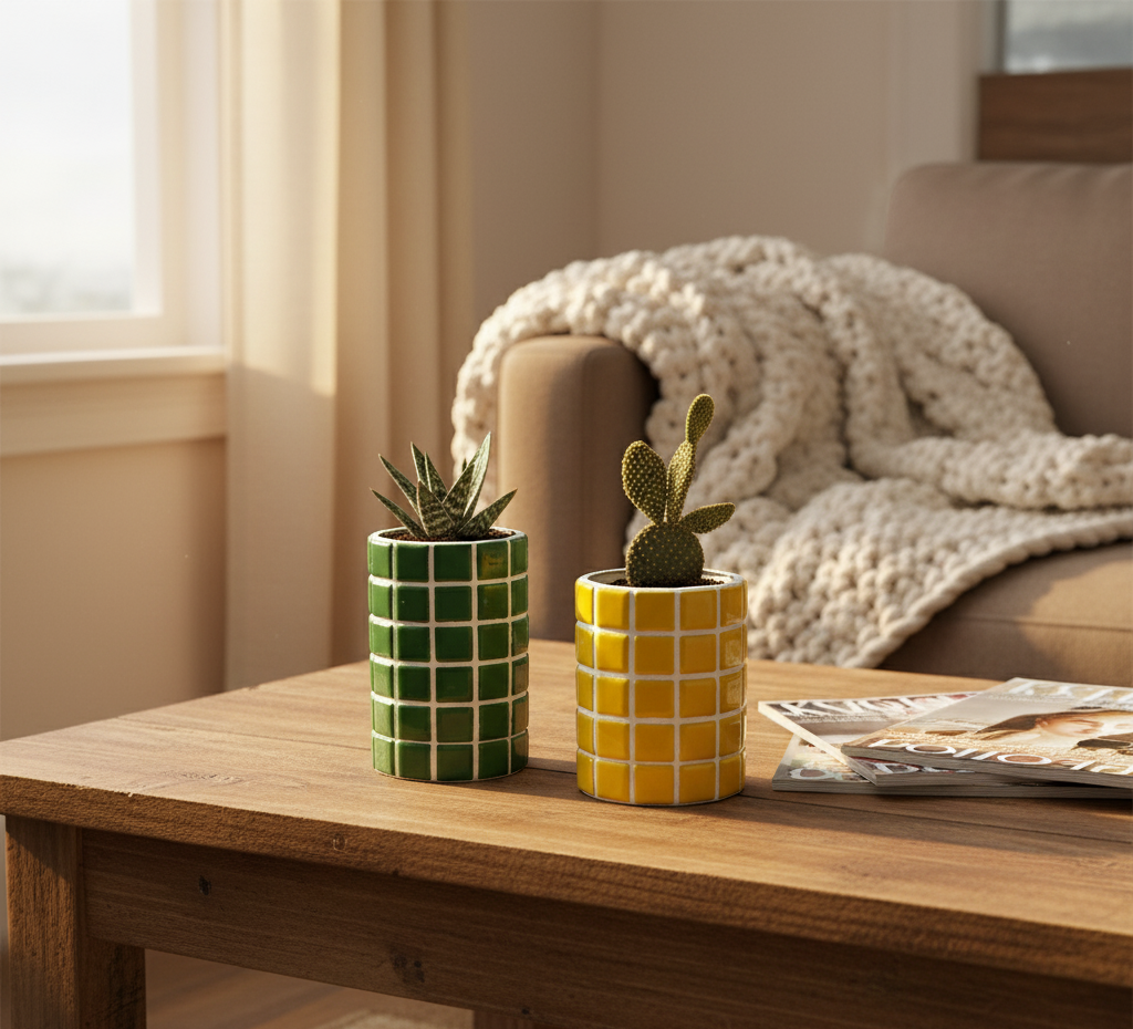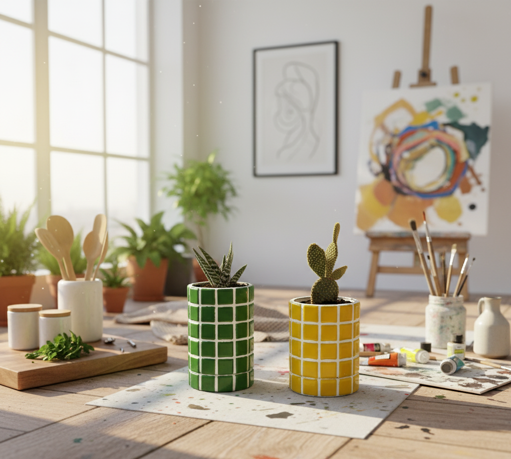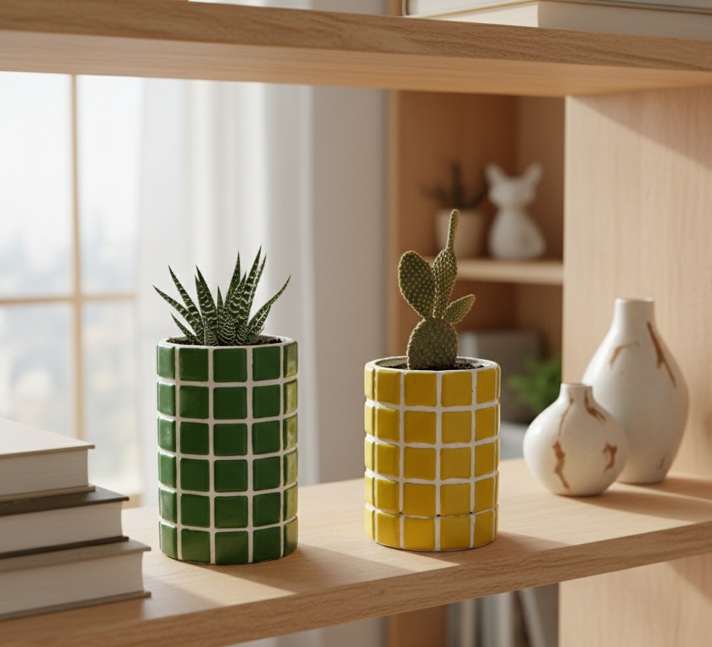 İkili El Yapımı Mozaik Saksı | Gizli Damla Tepsisi | Renkli Dekoratif Saksı