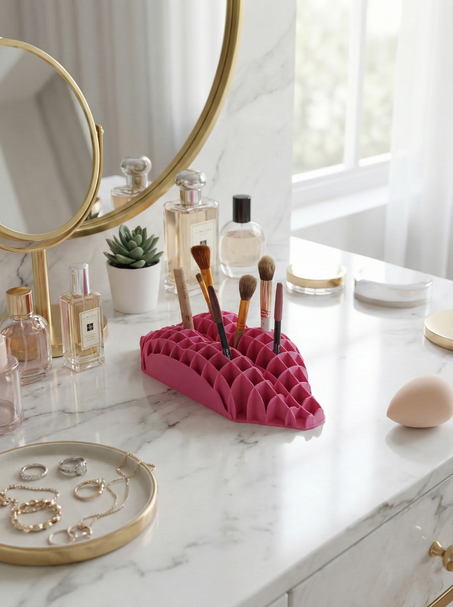 Makyaj fırçaları, rujlar, kalemler ve küçük aksesuarlar için ideal bölmelere sahiptir. Hem dekor ürünü hem de çok amaçlı organizer olarak kullanılabilir.