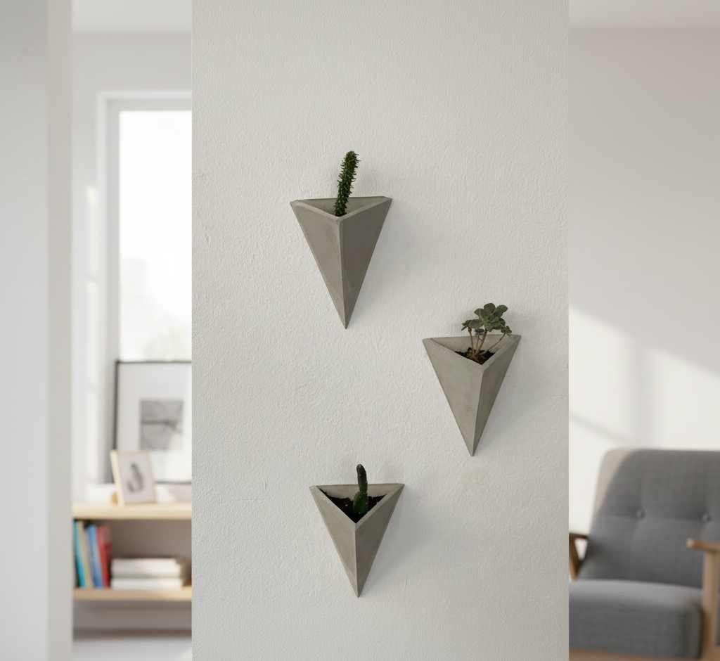 Üçlü Üçgen Beton Duvar Saksısı – Su Hazneli Modern Duvar Dekoru 20x25 cm